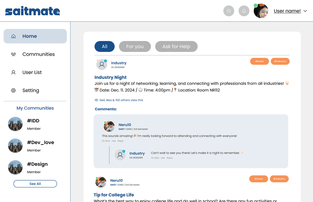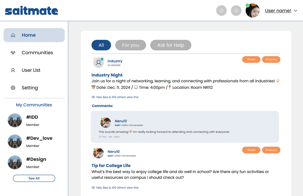 By fostering collaboration across programs, SAITMate helps students build connections, share ideas, and prepare for their careers more effectively.